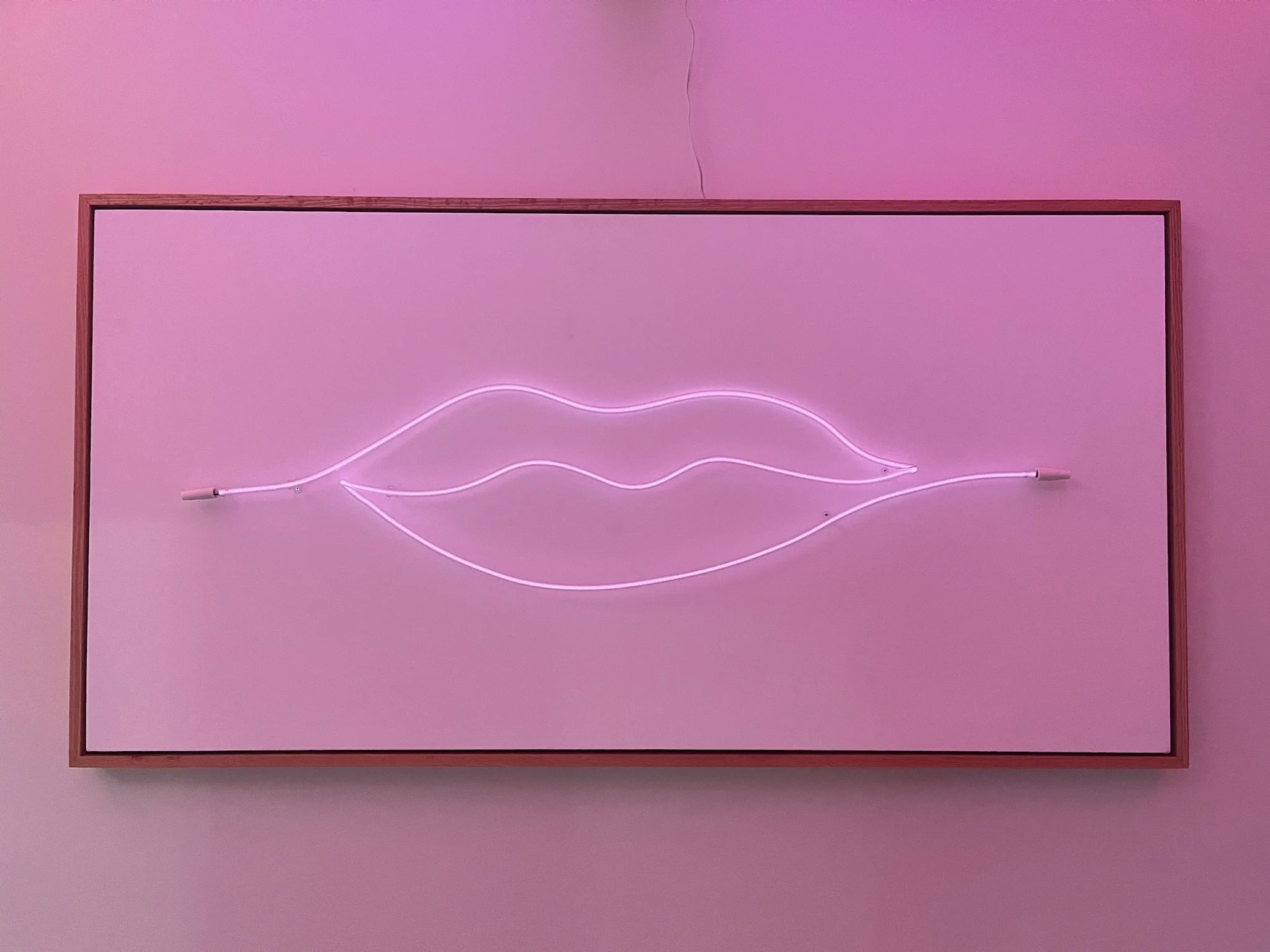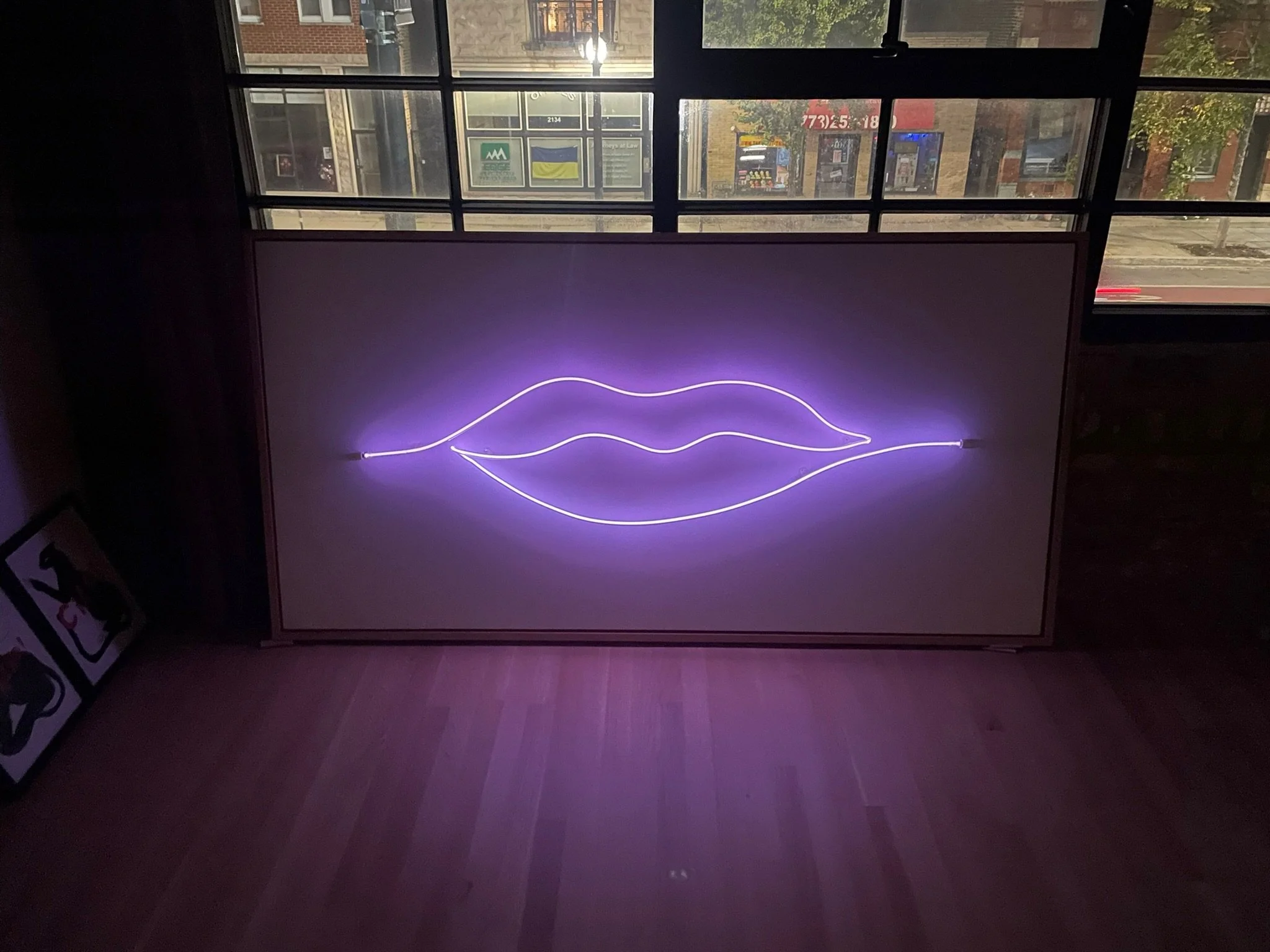 For sale. Single-line contour sketch of lips in 12mm glass, filled with pure argon mounted to floating canvas and white oak frame. 6’ by 3’. Contact for details.